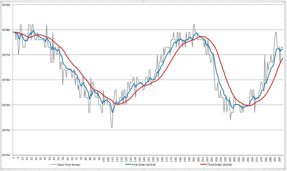 Noisy pressure sensor – data; filtered with first order and third order filter, both with d=0.8