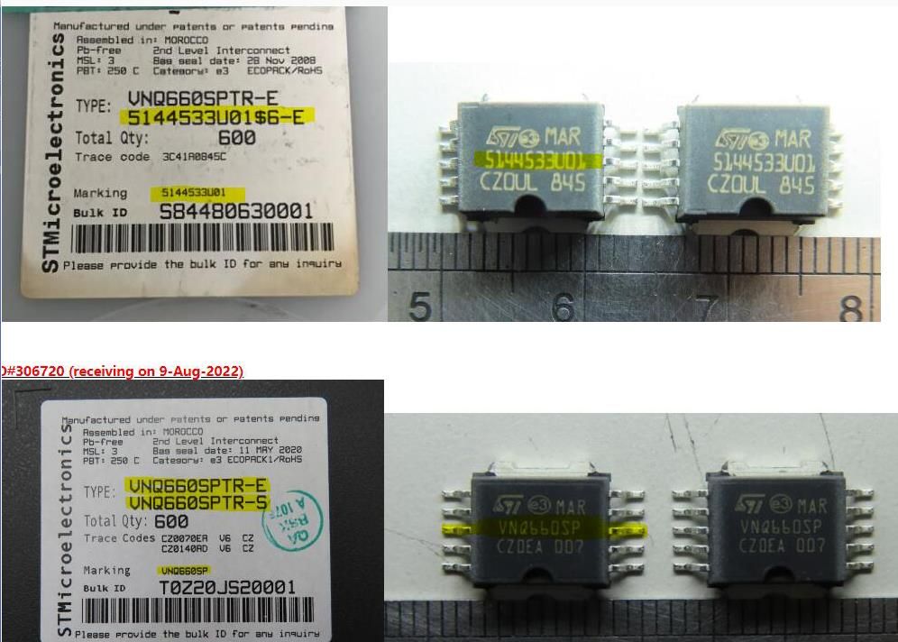 please help check below part label. Our company sell VNQ660SPTR-E, 08+, 28Pcs to Smith on 08/11. But Smith suspected the marking and label P/N of this ST. Is there anyone from ST could do us a favour to prove it?