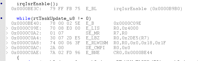 The breakpoint just before indicates the instruction which might have caused the exception is the one at 0x000BE3C, which, as you can see from the mixed mode assembly screenshot, is the irqIsrEnable().