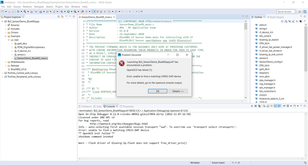 I have been trying to run the example codes from BLE_examples. It works well on BlueNRG_Navigator GUI. Unfortunately, It throws this error to every projects I try to run and deug on WISE-Studio. What must be the problem that causes this error?