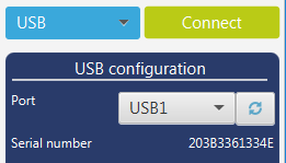 The user can now open STM32CubeProgrammer, select USB in the top right dropdown list and can click on the "refresh" icon. If a device appears in the "Port" dropdown list then the DFU mode entry has been performed correctly.