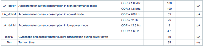 Hi @CHarr.1 , as described in the datasheet p.11. The first three rows are the current consumption of the ISM330DLC device with gyro in sleep and axl working, the next row both gyro and axl in sleep condition, and the last row the turn-on time (the wake-up time is a little faster than the power on time, but are the same order of magnitude).