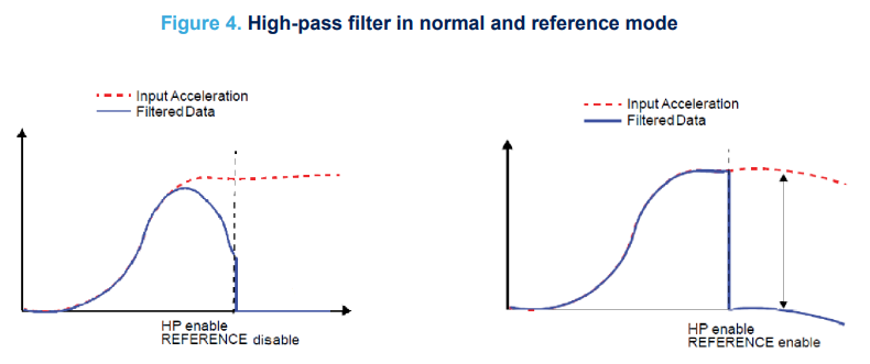 The high-pass filter can be configured in reference mode by setting the HP_REF_MODE bit in the CTRL7 register to 1. In this configuration the output data is calculated as the difference between the measured acceleration and the output values captured when reference mode was enabled. In this way only the difference is applied without any filtering.