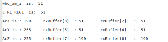 Display_printf(display, 0, 0, "AcX is : %d \t rxBuffer[3] : %d \t rxBuffer[2] : %d \n", AcX,rxBuffer[2], rxBuffer[3]);