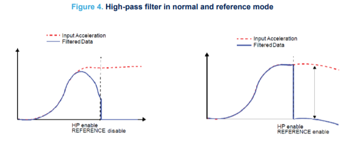The high-pass filter can be configured in reference mode by setting the HP_REF_MODE bit in the CTRL7 register to 1. In this configuration the output data is calculated as the difference between the measured acceleration and the output values captured when reference mode was enabled. In this way only the difference is applied without any filtering.