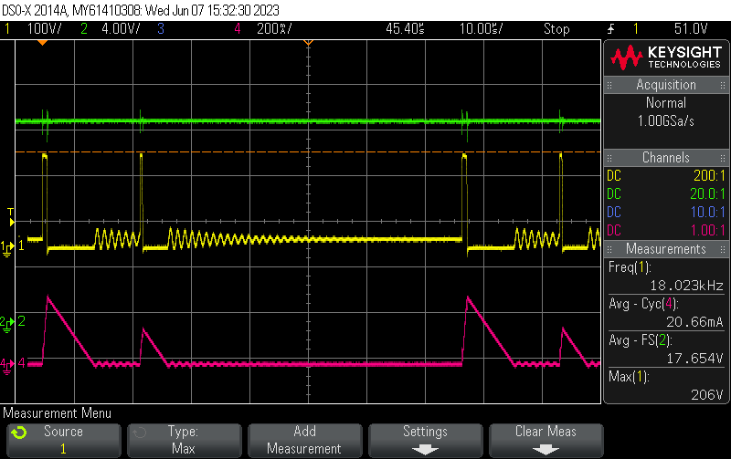 The second image (scope_0) was done also using 470µH and 47µF cap (50V) with a VDC of 206 volt. Here the burst mode is active as the avg. I is only 20mA.