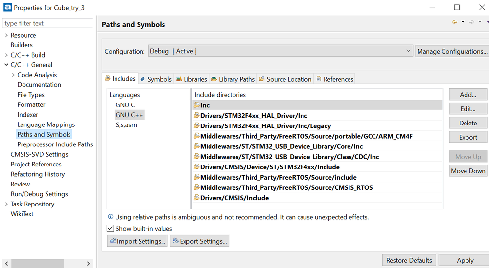 Extremely Annoying Bug 2: In Properties -> C/C++ General -> Paths and Symbols: