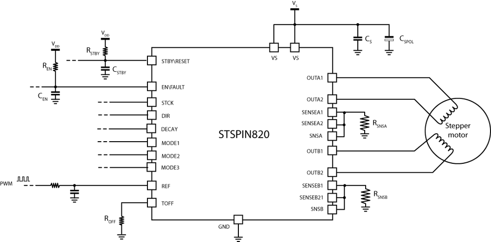 The device implements two independent PWM current controllers (with fixed OFF time), one for each full-bridge (the DECAY input determinates the behavior of the PWM current control during the OFF time).