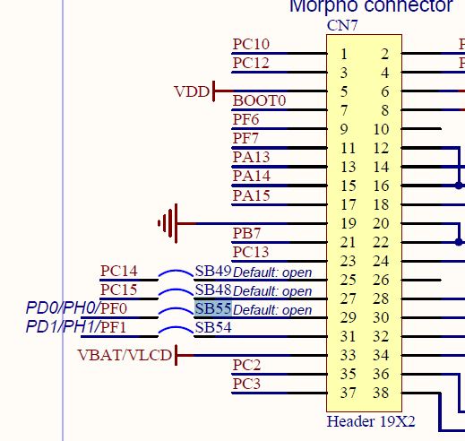 Are such things available? If so, my next issue is how I would connect it PD0/PH0/PF0 and PD1/PH1/PF1 on the CN7 morpho connector. The schematic shows SB55 and SB54 for this but says, default: Open. What does "SB" mean here? Solder Bridge? What does that mean? I need to solder x to y? (I don't know what these x to y are)