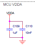 VREF+ and VDDA are tied together and derived from +3V3 via an EMI filter, without any capacitor.