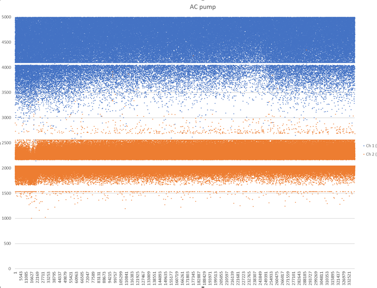 The above image shows data from ADC1 (blue) and ADC2 (orange). A/D values on Y axis.