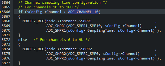 I use STM32CubeMX (5.6.1) with a STM32F373. When creating the hardware initialization with CubeMX there is an error in the "stm32F3xx_hal_adc_ex.c" file. When querying the channel used, an equals sign is missing for both "sConfig" and "sConfigInjected".