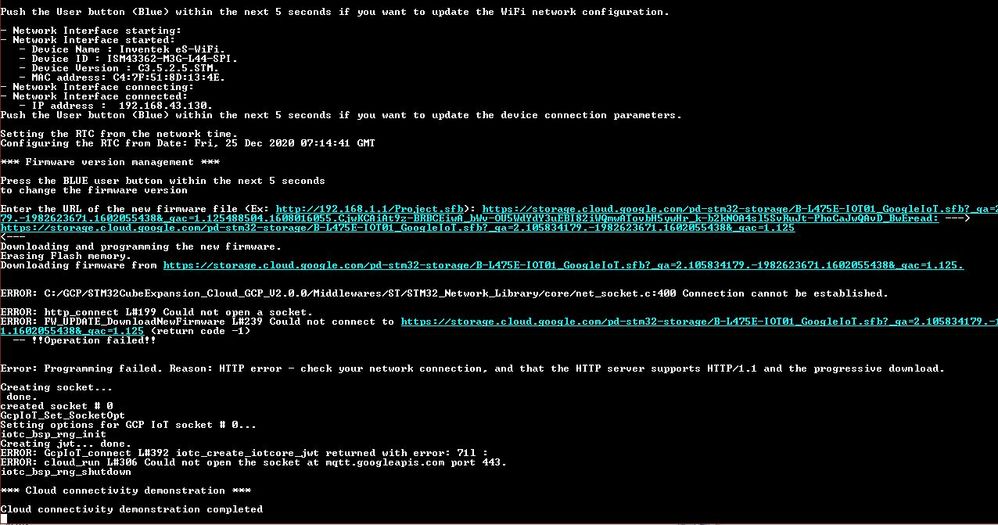 However, I needed to erase the board and tried to again follow the same process. Now I am facing root CA certificate authentication error. I am sure that I am using the same certificate as mentioned in the SDK path "Middlewares\Third_Party\GCP\samples\STM32Cube\globalsign_usertrust.pem" which was working last time. But now I am getting following error as shown in image.