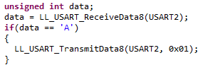 I am experiencing some problems when trying to receive data from PC using UART and then check if it is correct. I am using using LL API and this code is placed in while(1) of main function. For example, when I send 'A' from PC to STM32, PC receives response with '0x01' but if I try to send 'A' again, it does not respond anymore. Do I have to clear some flags of USART before receiving again?