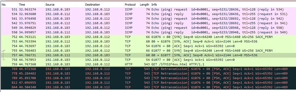 What I see now is that http_send() is called. http_write() cycles as the whole 9820 bytes of the page were sent but there are no packets on LAN (192.168.0.112 is the board, you can see the ping at the beginning).