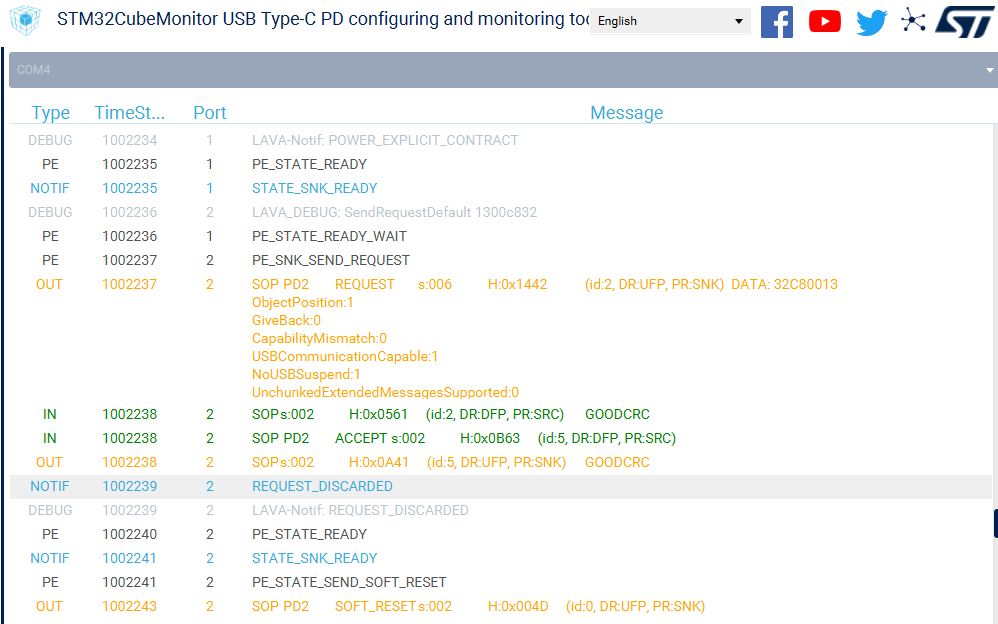 And I am reading debug messages through STM32CubeMonitor-UCPD.