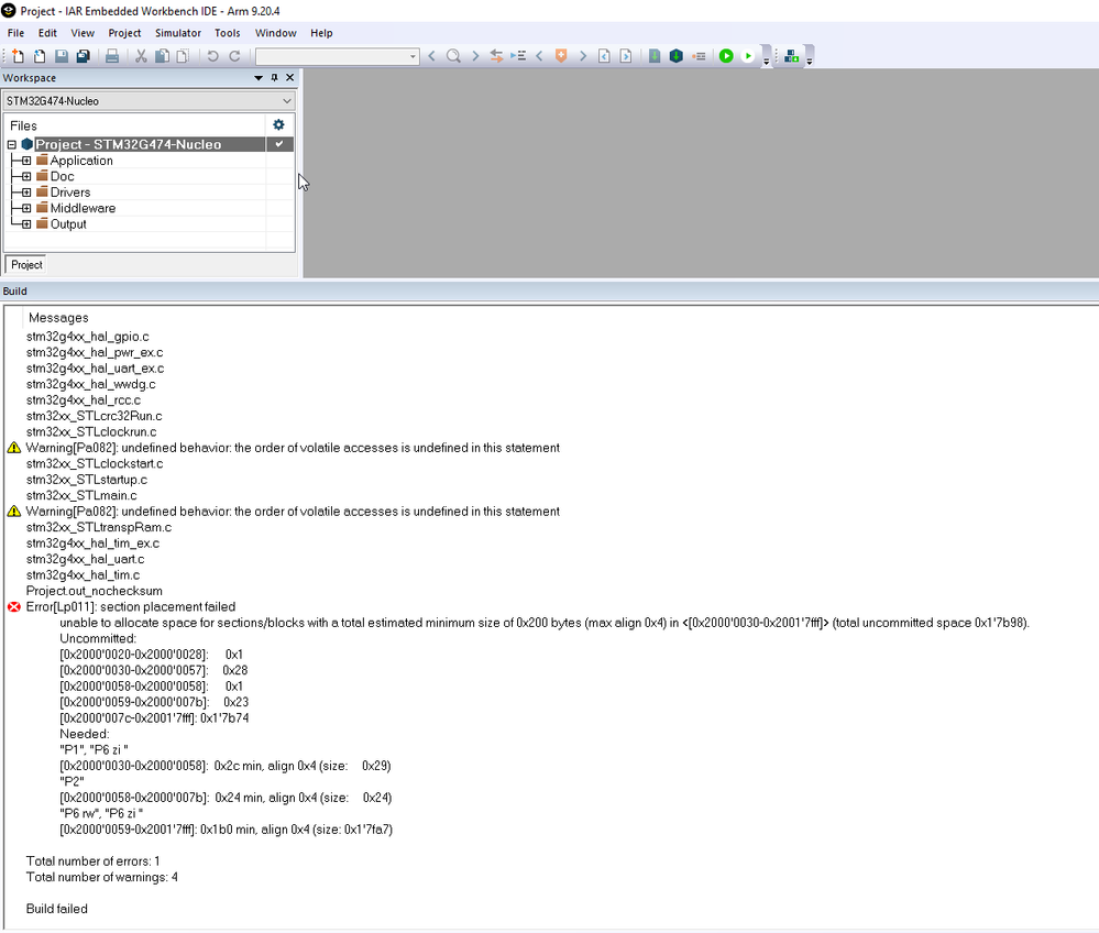The second case (G4 project) is different as the linker here signalizes to you that there is not enough space in the RAM to allocate sections P1, P2 and P6. Please, open the project map file and inspect which parts of your code fill these sections by data. You need allocate more space for these sections at linker configuration icf file and/or consider reducing their sizes.