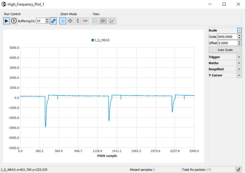 To test, I set the duration of the first phase to 10 seconds in the Rev-UP dialog and reduce the torque. This generates the current profile shown below. The current follows the reference value most of the time, but is periodically disturbed. This disturbance follows the rythm of the beeping. If I set the reference current higher (to generate enough torque to turn the motor), the controller trips for overcurrent.