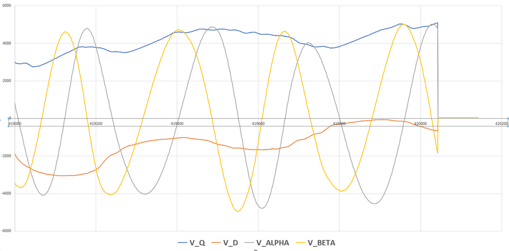 The I_B and I_BETA_MEAS waveforms are phaseshifted to each other, and at one point during startup there is a huge spike happening to both. I_A and I_ALPHA_MEAS are exactly the same values, so the waveforms are perfectly laying on top of each other (so you think there is only one waveform). Is this a bug in motor pilot or is it normal that those two are exactly the same?