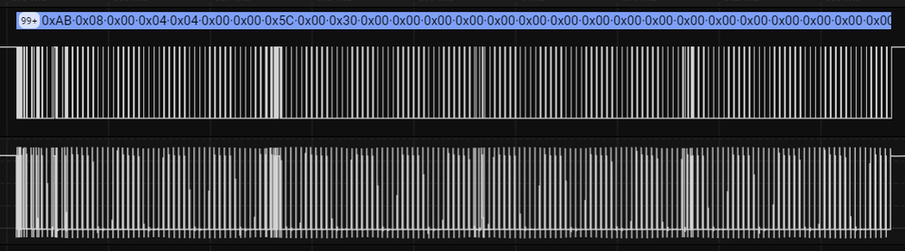 The first byte 0xAB is the packet size of 171 (actual packet size is 172 with size byte included). When this packet is read from the DMA we will get all of the same data less 1 byte somewhere in the middle.