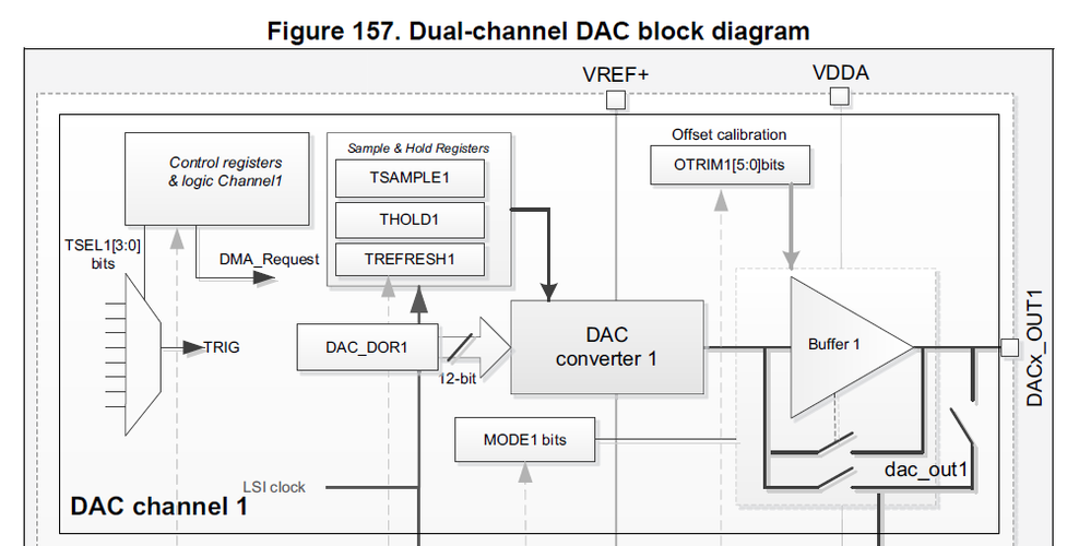 001: DAC channel1 is connected to external pin and to on chip peripherals with Buffer