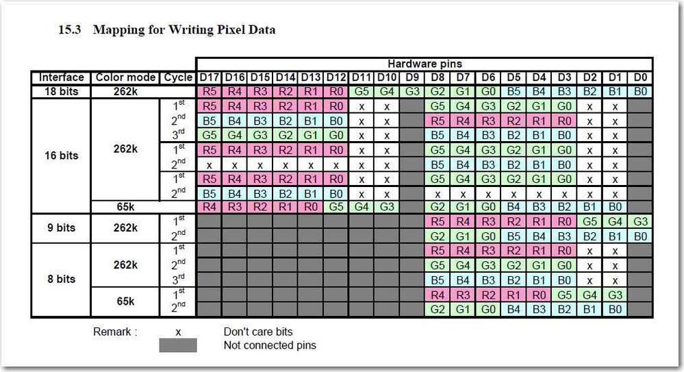 FFS I'm trying to understand where the colour bits are within the 16-bit word, is this a hard concept to grasp? I ask for the datasheet for your panel so I can figure it out. I'll make an educated guess at the 5:6:5 format// For the specific BMP, 8-bit per pixel, 24-bit palette
