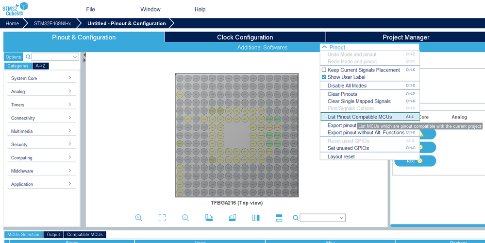 2. Go to the Pinout menu and select List Pinout Compatible MCUs. The Pinout compatible window pops up.