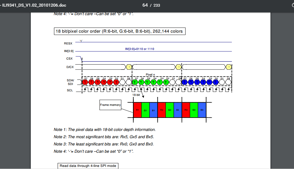 I would like to avoid the extra hardware, if possible. But anyhow, it is good to know such a solution exists. I am additionally looking at the 8 bit SPI transfers, as you mentioned previously in the thread. Wondering whether that would work with the LCD configured in RGB666 mode. If that works, it would be even better, to switch to 18bit mode from the 16bit mode.