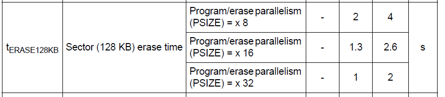 The flash erase time may be about below 100ms on the code of My predecessor.But the erase time of my code is over 2sec like the above table.I think that there may be any setting to reduce the erase time.My predecessor and I use the same code to erase the flash like below.--------------------------------------------------------------------------------int8_t FLASH_If_Erase(uint32_t StartSector){ uint32_t FlashAddress; FlashAddress = StartSector; /* Device voltage range supposed to be [2.7V to 3.6V], the operation will be done by word */ if (FlashAddress <= (uint32_t) USER_FLASH_LAST_PAGE_ADDRESS) {#ifndef USE_GES_MEM_CONFIG //FLASH_EraseSector(FLASH_Sector_4, VoltageRange_3); /* 64 Kbyte */ //FLASH_EraseSector(FLASH_Sector_5, VoltageRange_3); /* 128 Kbyte */ FLASH_EraseSector(FLASH_Sector_6, VoltageRange_3); /* 128 Kbyte */ FLASH_EraseSector(FLASH_Sector_7, VoltageRange_3); /* 128 Kbyte */ //FLASH_EraseSector(FLASH_Sector_8, VoltageRange_3); /* 128 Kbyte */ //FLASH_EraseSector(FLASH_Sector_9, VoltageRange_3); /* 128 Kbyte */ //FLASH_EraseSector(FLASH_Sector_10, VoltageRange_3); /* 128 Kbyte */ //FLASH_EraseSector(FLASH_Sector_11, VoltageRange_3); /* 128 Kbyte */#else FLASH_EraseSector(FLASH_Sector_6, VoltageRange_3); /* 128 Kbyte */ FLASH_EraseSector(FLASH_Sector_7, VoltageRange_3); /* 128 Kbyte */#endif } else { return (1); }--------------------------------------------------------------------------------How can I reduce the erase time?Is there any setting to do that?Thanks.2016-01-26 5:19 PM