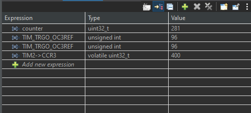 I can trigger the first position but now I'm trying to update TIM2_CCR3 register so at next position TIM2 Channel 3 can trigger TIM1.