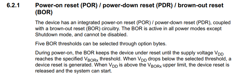 BOR circuitry will reset the chip until the VDD voltage is above the POR threshold, and then release reset after tRSTTEMPO.