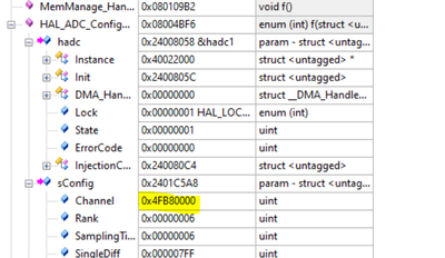Please refer to the image above. I can now confirm that hadc1.Instance correctly points to ADC1 at address 0x40022000; however, sConfig.Channel appears to be mapped to an incorrect memory location. Any suggestions to help resolve this issue would be helpful. Thank you.