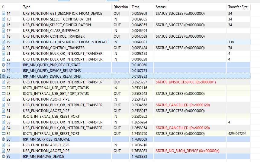 I am using USB Monitor Pro to check the communication and the USB communication cannot be established (as shown below)