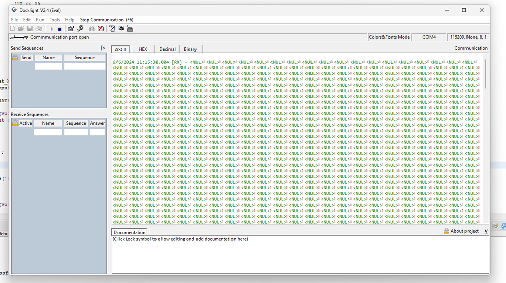 I am trying to transmit character over USART2 using STM32L476RG EVB. I am getting "NUL" at the debug terminal instead of the transmitted data. please help. Here is the code and debug terminal:Debug Terminal