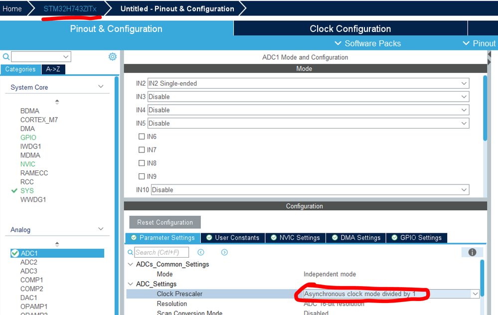 I developing an application where I need to use 14 bit ADC sampling at 2 MS/s. This needs a fast ADC clock speed. I am using a V version chip that has a built-in /2 divider on the ADC clock. When I upgraded to STMCube FW V1-9.0 the other week, the code prodused defaulted to "Asyncrnous clock mode divided by two. The code produced was hadc1.Init.ClockPrescaler = ADC_CLOCK_ASYNC_DIV2; This gave a net division by 4 yielding a ADC clock frequency of 10 MHz which crippled my application. In previous versions it was divided by 1.