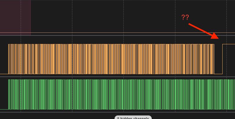 I wonder if what's happening now is that things are no longer properly synchronized - it looks like the SPI clock continues to run separately from me yanking CS high or low.