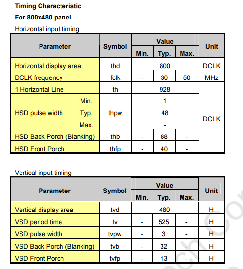 using DMA2D and FMC interface(Flexible Memory Controller – Working at 200/2 MHz).Timing LCD TFT 7 inch from datasheet: