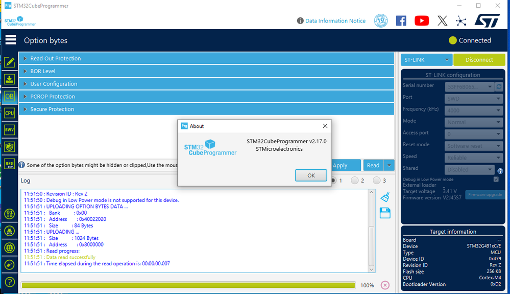 I also noticed that with the previous version of the cubeprogrammer (2.16) the option bytes are shown