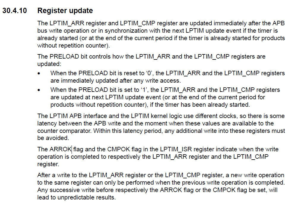 }There's application note AN4865 related to use LPTIM as a pulse counter and it doesn't say anything about LPTIM_ARR register neither LPTIM_ISR waiting for ARROK flag (4th bit). Also, on the example code, they expect a constant pulse signal arriving so this problem never happens.