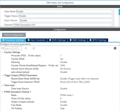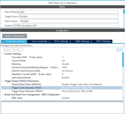 Hi everyone . I have timer problem again. I use STM32G431KBT6. I'm using timers. timer 3 for pwm pulse direction servo motor and timer 8 for pwm speed control dc motor. But when start timer8 pwm, timer 3 is starting same time. What could be the reason for this? My timers set: