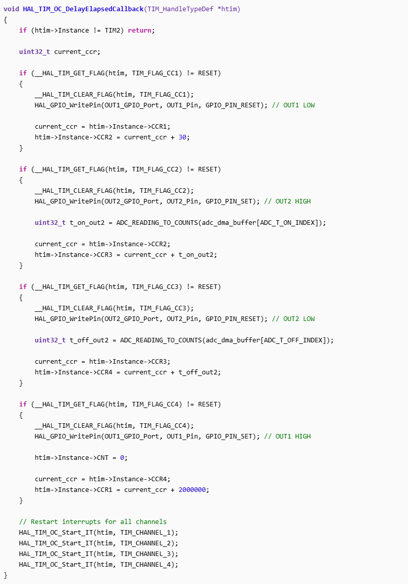 Thank you for the detailed description and the code. Your approach using TIM2 output compare channels and ADC inputs for variable timing is good, but the issue with only one output toggling and the interrupt flags being cleared before your if checks likely comes from the way the interrupt flags are handled and the logic in your callback.