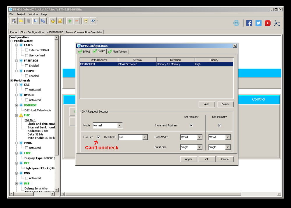 There is a pop-up when the cursor is placed on the Use Fifo checkbox that states: ''DMDIS bit (Direct mode disable) is forced to 1 by hardware for memory-to-memory transfers''.