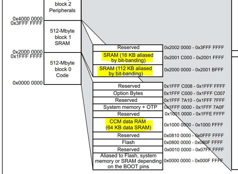 CCM memory is not being used for anything, From the ref manual : CCM (core coupled memory) mapped at address 0x1000 0000. There is 64k of it. That is below the above RAM so clearly not used. But the 32F4 data sheet says "Up to 192+4 Kbytes of SRAM including 64-Kbyte of CCM (core coupled memory) data RAM" so maybe the CCM is the upper 64k? In which case some remapping must be going on. Or maybe the 192k is not contiguous; you just get 128k and the 64k CCM memory is elsewhere.