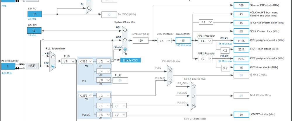 Yes, my point was only that all of my clocks driven off of HCLK are much slower than yours, and I have no issues with the display. My LCD-TFT clock was unchanged, at 30MHz, from using PLLSAI. I agree with others, definitely worth trying to get 48MHz from that.