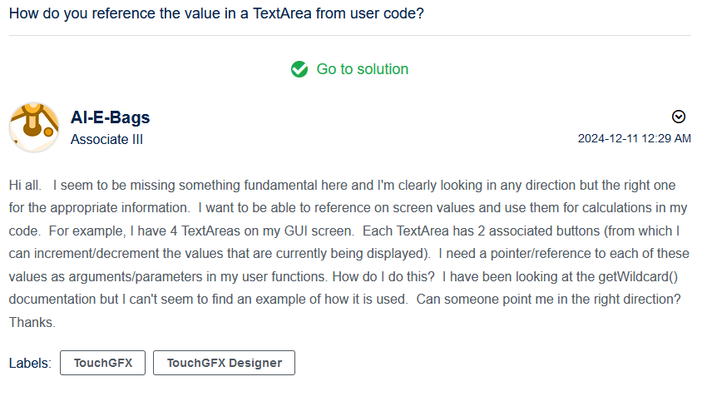 Hi all. I seem to be missing something fundamental here and I'm clearly looking in any direction but the right one for the appropriate information. I want to be able to reference on screen values and use them for calculations in my code. For example, I have 4 TextAreas on my GUI screen. Each TextArea has 2 associated buttons (from which I can increment/decrement the values that are currently being displayed). I need a pointer/reference to each of these values as arguments/parameters in my user functions. How do I do this? I have been looking at the getWildcard() documentation but I can't seem to find an example of how it is used. Can someone point me in the right direction? Thanks.