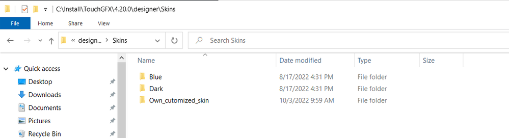 1- Go to your TouchGFX installation path, and navigate to this folder : "TouchGFX\4.20.0\designer\Skins"