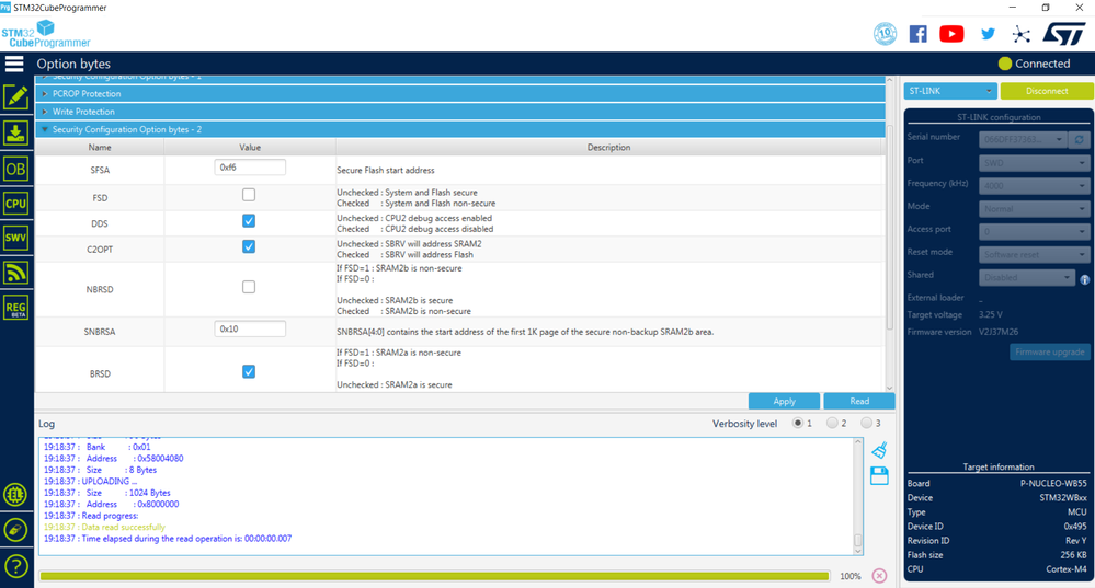 Then execute the same with the stm32wb5x_FUS_fw.bin binary at the same location. The SFSA should not change with this second upgrade.