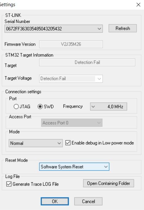 Then I installed STLink Utility . I can`t connect using that either. I can the STLink version number but STM32 Target shows `Detection failed` . Target Voltage `Detection fail`