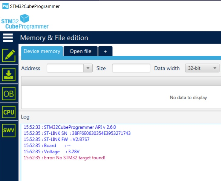 here > 08:53:48 : Device ID : 0x497 < STlink is connected to target : = Device ID : 0x497 Revision ID : Rev Z Device name : STM32WLxx