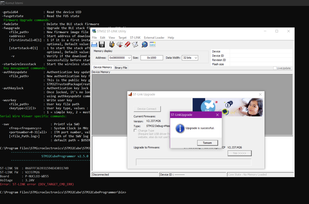I have a STM32WB55 card. I could not make the Bluetooth connection. I thought of the possibility that the problem was software and I deleted all the data on the chip. Then I try to download firmware again but I get an error. Can you help me on this topic?